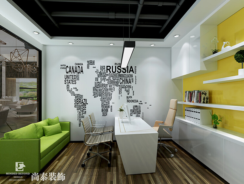 同多数互联网公司一样,千讯工作者主要为年轻人,不仅要求他们能学握专业知识,同时要求他们具有良好的沟通能力、创新的思维方式。因此,在尚泰装饰给千讯办公空间的设计中,我们可以看到一场“理性与感性的相遇”,空间色彩以白、绿、黄为基调,搭配天花板和地板的黑与灰,色块的合理碰撞将商业空间与艺术完美结合,打破了以往视觉上枯燥沉闷的工作环境,力求为员工提供最佳的沟通环境,最大限度地启发他们的创新思维。