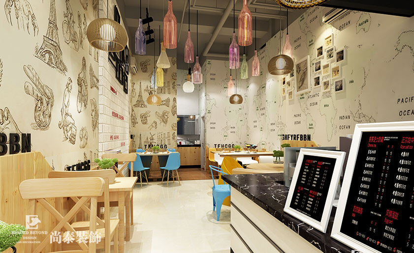 尚泰装饰集团设计师在这个39平方米的空间里,通过搭配原木色防腐木,配合创意灯饰、墙纸等手法,打造一个小巧而干净、环保而健康、时尚而个性的饮品空间,正符合奶茶店的市场消费群体定位——初、高中学生,青春洋溢,简洁、个性、时尚颇受周边消费者欢迎。