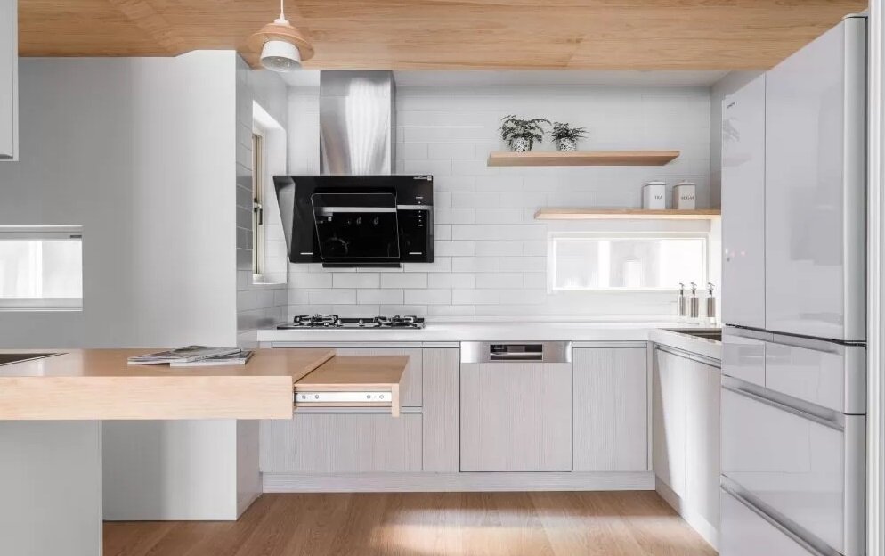 若中岛橱柜只有单一功能,那会很容易沦为占空间的设计,不妨学学橙居空间设计的案例,平时只要小台面作备餐台,若要作为餐桌使用,则能弹性拉合桌板,用不到时收入台面能让平时厨房动线更开阔;陶玺空间设计则是在中岛橱柜下方加装滚轮,在小厨房内可以随意移动,机动性高又不怕占空间。
