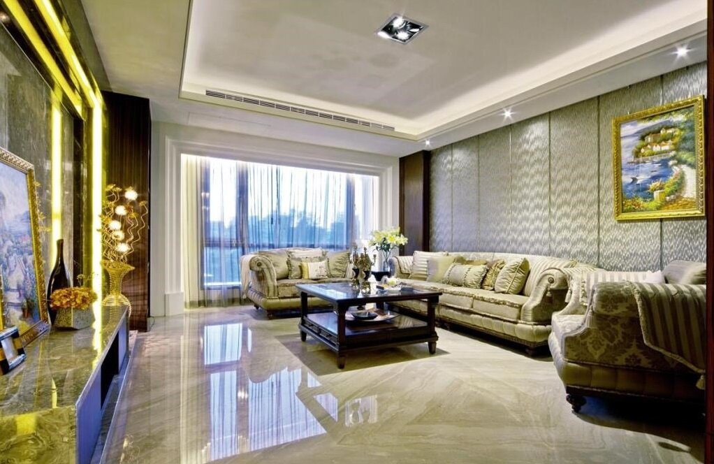 主要建材:茶色玻璃、皮革绷布、烤漆、大理石、实木木地板、镜子、文化石、壁纸