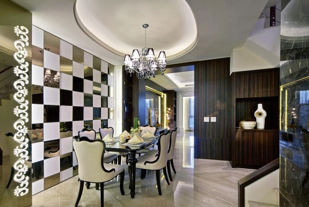餐厅墙面利用茶玻与白色烤漆墙面,以 4 个 1 组加以组合,形成律动,玻璃反射景象,与一旁的雕花玻璃相呼应,有 Bling Bling 的闪亮现代感。
