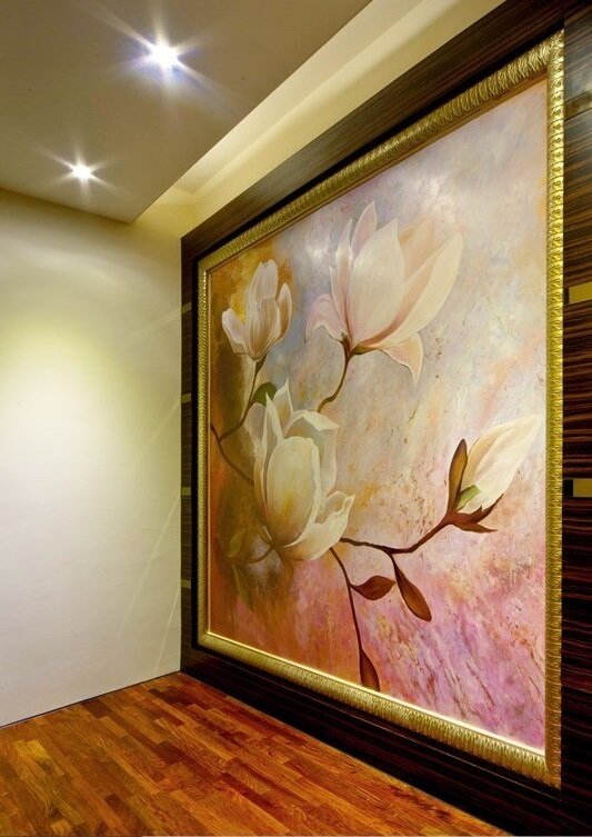 玄关是重要门面,在公领域的 2 楼电梯口玄关以金箔贴成端景,两旁再以皮革做出菱形格纹,营造华丽气势。但私领域则舍弃金碧辉煌,改以 2.8 × 3 公尺的大型画作做出端景,充满浓厚的人文艺术气息。
