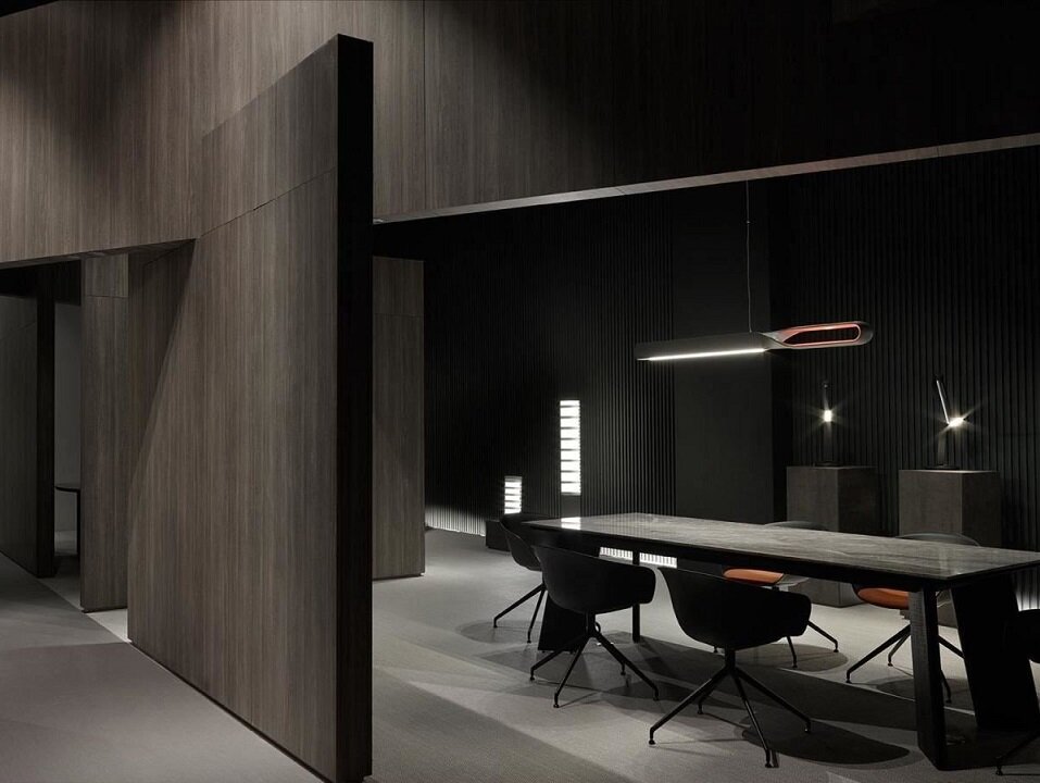 低调的辅助照明,让现场展示的灯具大放异彩,呈现戏剧性的光影效果。