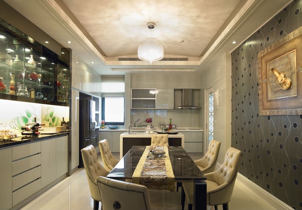走进办公室会客区,即可见醒目的金箔字画,释放出尊贵雍容的气息,以“精进”二字传递企业文化形象,并透过木质格栅、内嵌台面的展示收藏物与绿意植栽,妆点会客区的典雅中式气息;在长型会议室内,则配置间接光源添加空间暖度,搭配墙面字画及鸟笼挂饰等物,带出艺术品味;搭乘电梯来到住家空间,设计师刻意装置电梯做出领域切换,并设计一个充满质感的玄关,做出宁静的端景意象,宣告这里为不受干扰的私人居家领域开端;在客厅领域,透过米黄大理石电视墙搭配同色系的皮革沙发,展现色彩和谐的大器空间感,并点缀天花线板,妆点出新古典的居家层次;同时,以透明拉门弹性区隔客厅与餐厨领域,规划出热炒区及轻食区,打造出清爽不受干扰的餐厨氛围;来到私领域主卧前,则会经过被视为过渡地带的起居室,以造型拉门做两者之间的界定,主卧则配置红色床头板,与紫色绒布床尾椅,创造寝卧中雍容且醒目的焦点色彩!