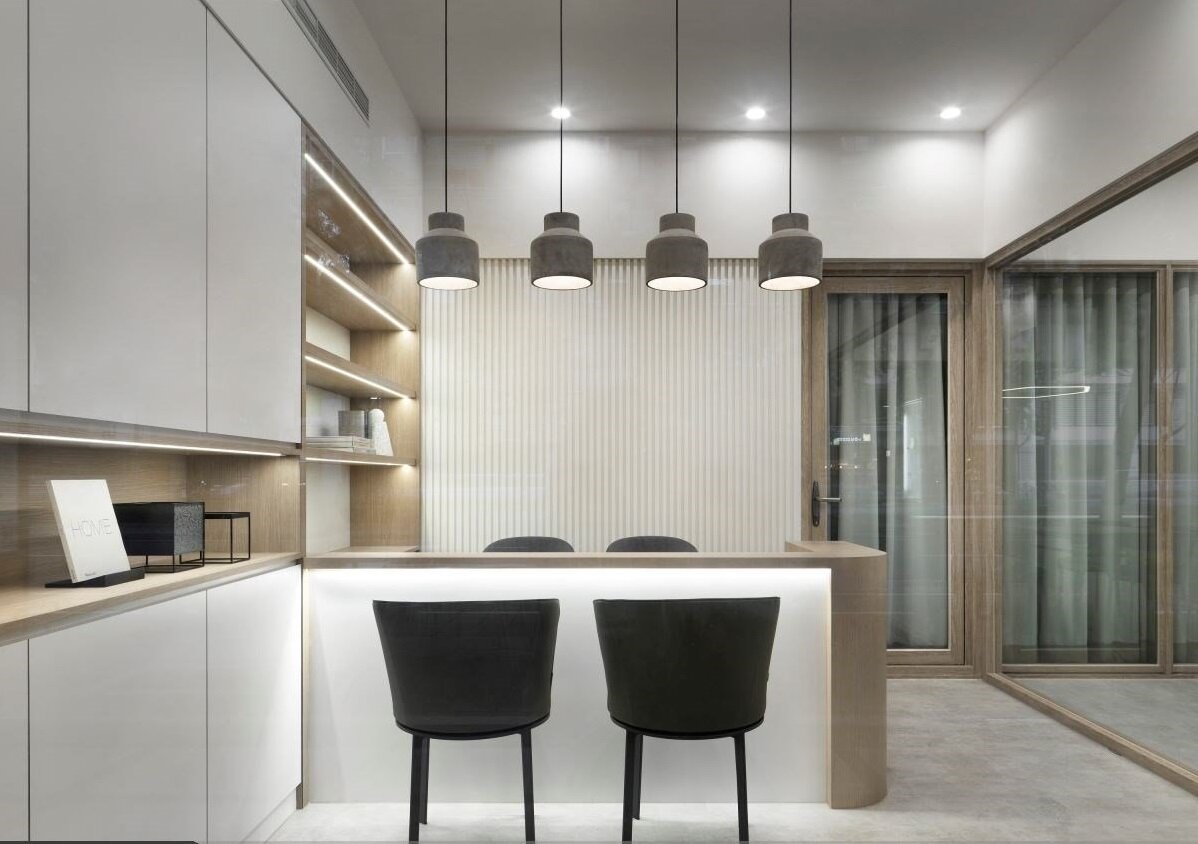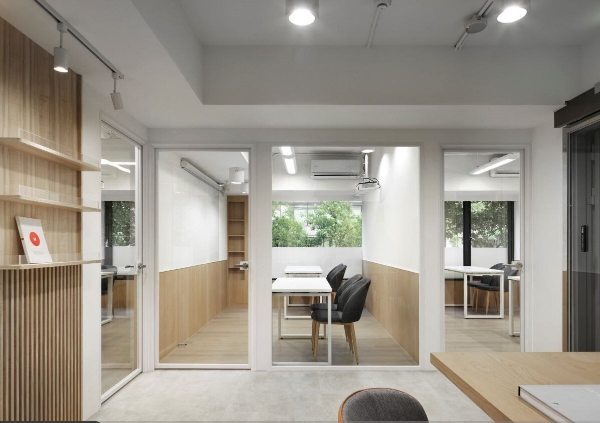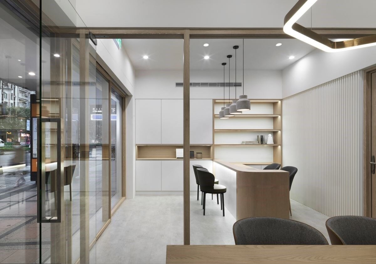56 坪的老屋以清新简约的无印风格为基底调性,表达重视开放、直接沟通的年轻企业精神,并抛除传统补习班设计常见的封闭狭窄的隔间,设计师运用原始结构呈现宽敞空间感,以开放透明元素贯穿整体设计,大面的玻璃落地窗引注丰沛的外部光线,即便柜台和会议厅分于两侧,透过玻璃墙的视觉穿透效果,也能保留一望无际的空间感受。教室设计则以保持明亮、无压力为主轴,沿用大面积的玻璃材质增加穿透感、引进充裕的光线,辅以温润的浅色木材质营造专注明亮的舒适学习空间。