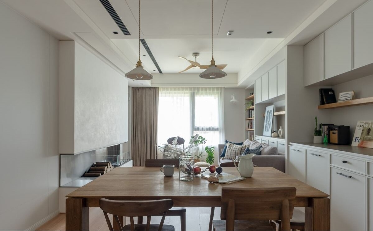 开放式的客厅与餐厅,以浅色为基调,搭配木地板与餐桌,增添温润感受,客厅挥别制式的电视墙与电视柜,改以投影方式,电视墙特殊涂料具丰富视觉变化,下方柴火放置区,以镀钛金属点缀时尚感,与现代风格真火火炉相呼应。公共区域包含先生的工作桌、3D列印机实验区、男孩单杠运动区,与阅读区,机能强大!