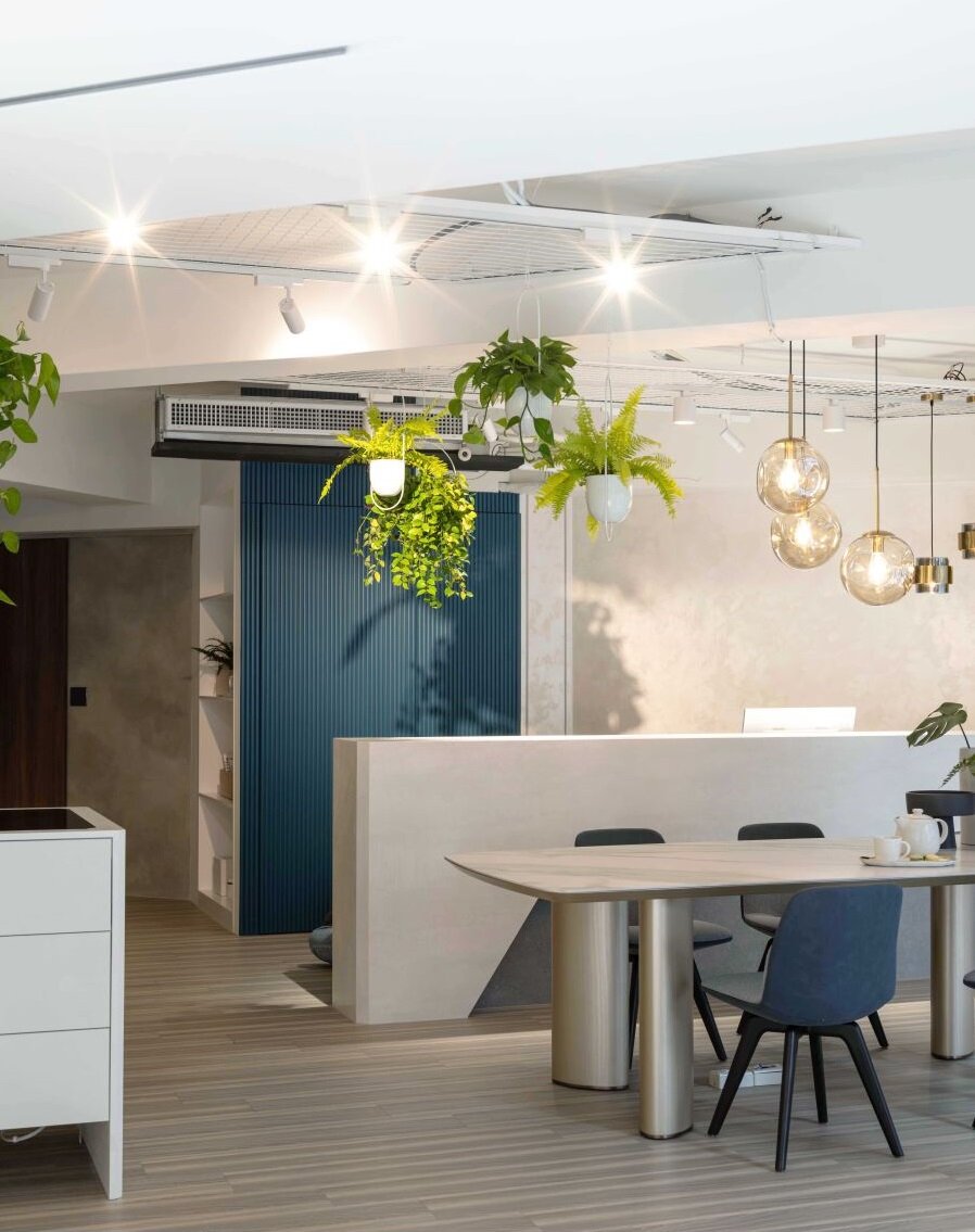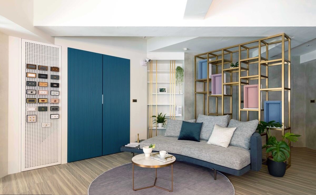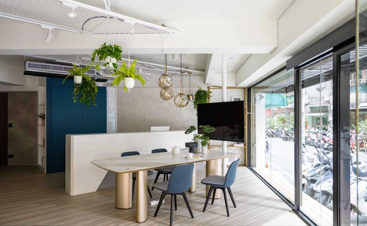 原有的三角窗调整成两面出入口,同时将屋内转向,透过斜切的40度配置配合两扇入口的设定。讨论区以旋转电视墙配合对内与对外的投放需求;主要的柜台区背墙以灯带设计抬升视觉尺度,步入室内即感受高挑、宽阔的视觉效果;而西班牙耐丽石台面,则创造温润的空间气息。重要的门片展示区,设计师顺应采光动线安排门片展示区,采光充沛的领域中,让门片以灵活移动、转动的多角设计,在不同的光影与角度中,提供给客户全方位的展示效果。