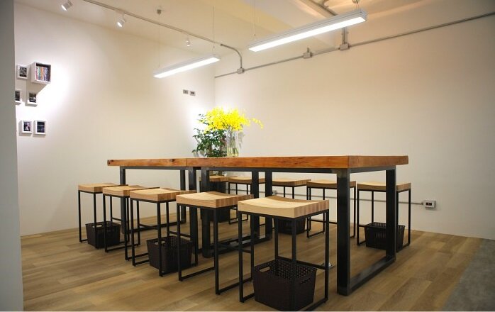 舍弃了一般咖啡厅小桌椅配置,店内最重要的座位区我们选用桧木拼接的实木长桌,两侧的实木自然边、桌板的厚实感、金属桌脚的俐落,让空间变的开阔沉稳。