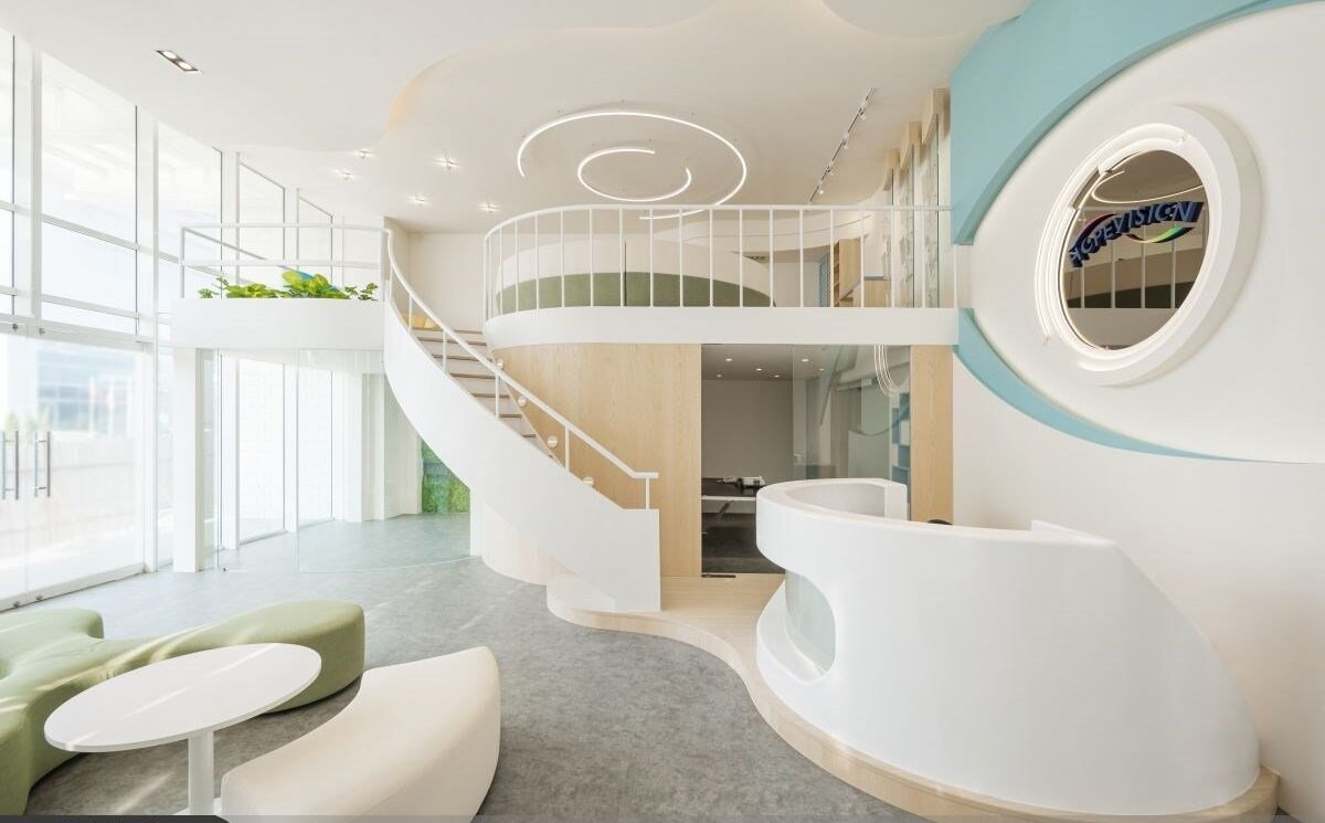 办公室装修: 森林里来首轻快圆舞曲!绿植墙与澄净蓝白相遇,实现科技公司的清新正能量