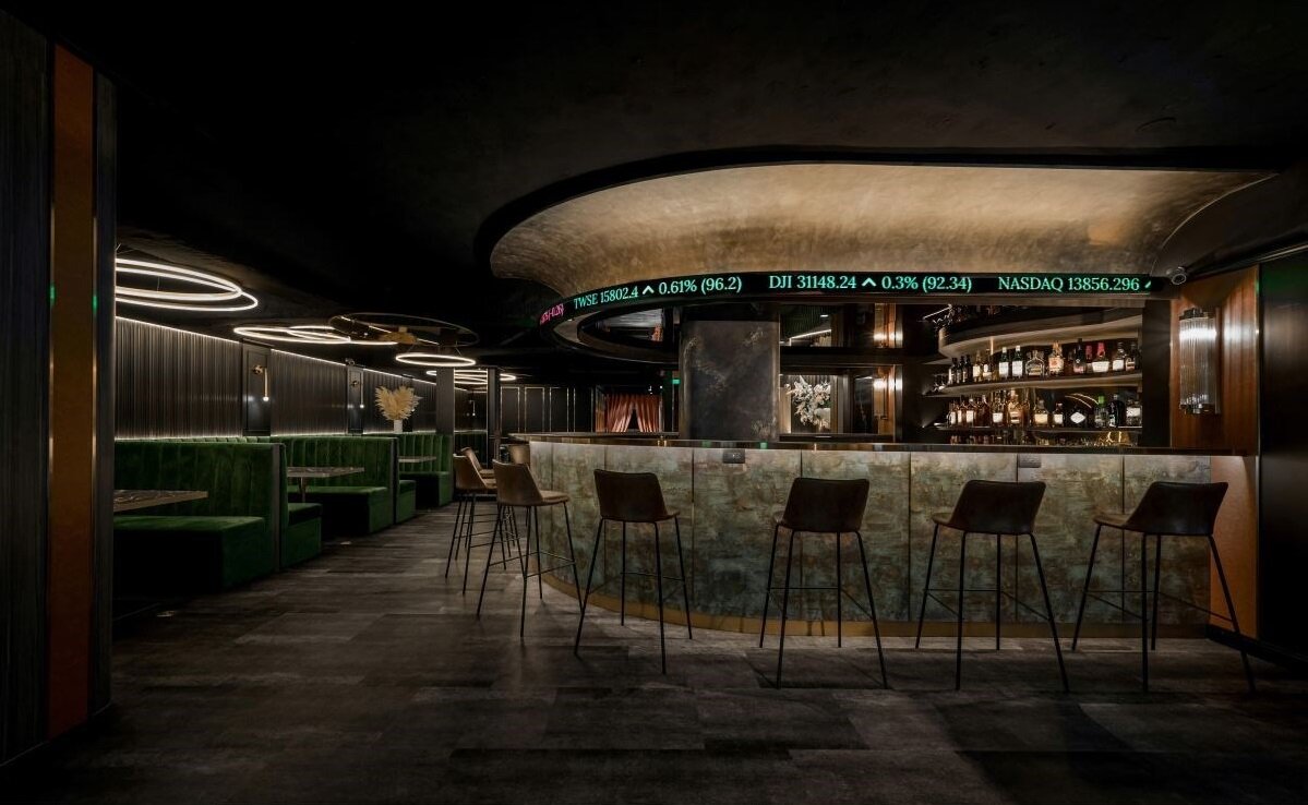 为诠释英式古典混搭现代奢华的风格,设计师以沈稳的墨绿为主题,墙面选用带绿的青铜涂料,地面则保持清水模细致低调的质感。而象征品味与地位的吧台则运用了仿制青铜美耐板、镀钛金属和玻璃展现奢华风范;开放式包厢座位的墨绿绒布呼应空间调性,也与美股指数涨幅的绿不谋而合。