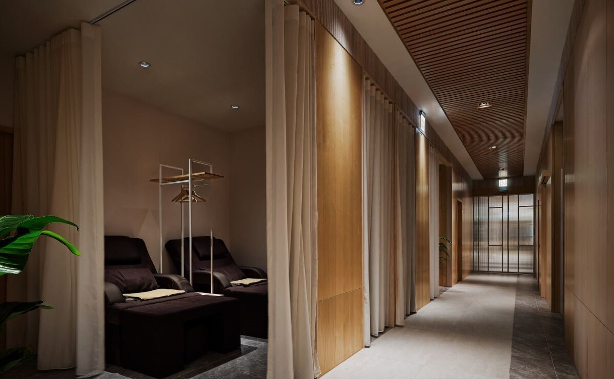 玄关迎宾处以白色系为场域基调,明亮感透过浅色木作贴皮与植栽发挥得淋漓尽致,大面落地窗以格状分割造型,搭佐错落的吊挂层架并设置间接光源,不仅不阻碍光线进入,更为空间增添一丝活泼趣味性,让舒适惬意成为进入空间内的第一印象;后方为开放式的脚底按摩与全身按摩区,架高地坪区隔相异的空间属性,侧边的大面落地窗依稀可见繁华都会与山峦景色,让顾客于此处全面舒缓身、心、灵,尽情享受烦扰日常中的平淡惬意;空间底部为全身按摩单间与VIP房,考量到消费性质所需的私密感,以封闭式的单一空间为设计主轴,简约的设计与温润木质相互呼应,柔和灯光结合纱幔,打造现代禅意的独有场域。