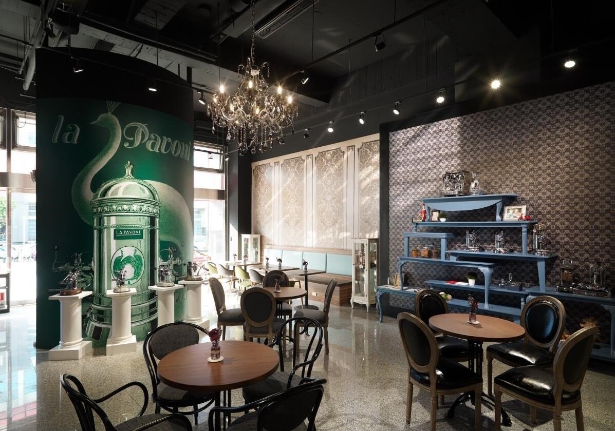 店铺装修:咖啡爱好者的天堂!欧式古典X精彩跳色 围塑百年品牌La Pavoni的历史人文质感