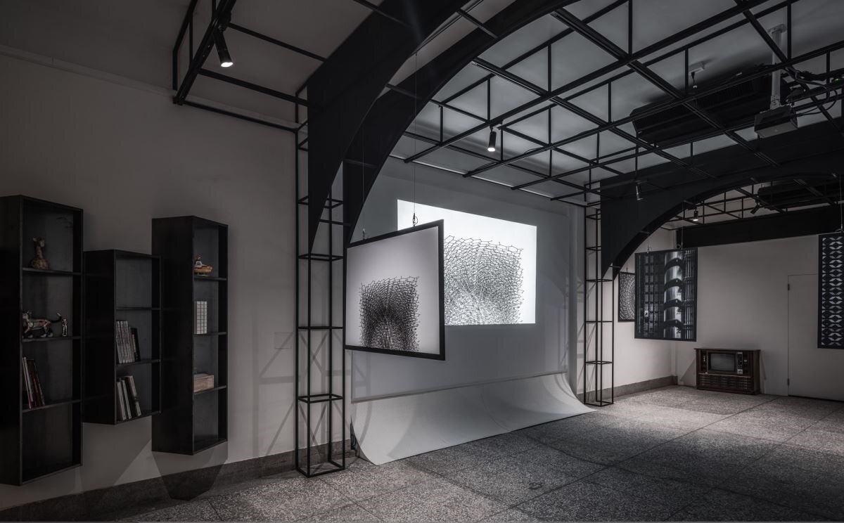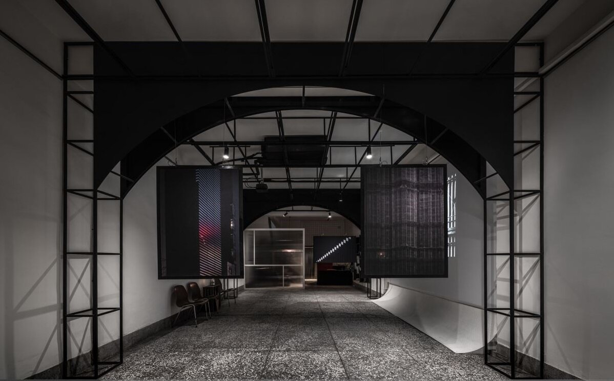 空间里异材质的活用,像是马赛克小砖、阳台栏杆、玻璃与铔板等,诉说著传统与现代的交会与相融;入口外观结构铺陈铔板,金属冷调质感展演摩登现代风,再搭配红色块状的玻璃大门,红色视觉与后方台式铁门相互呼应,成为无彩色空间里唯一的亮彩,赋予戏剧性张力。以白色为基底的画布概念下,天花板透过铁件以拱、柱的元素,拉出景深且形塑视觉层次;摄影墙借由立面与地面交界处拉出弧度的无缝墙做法,解决墙角垂直面的视觉阴影,诠释绝佳的艺廊展演。透明光盒的独立空间串连起二楼与地下室,半透光的中空板形塑轻盈、通透的氛围,领域里透过绿色壁面、复古沙发与吊灯,让时光仿佛回到怀旧年代。