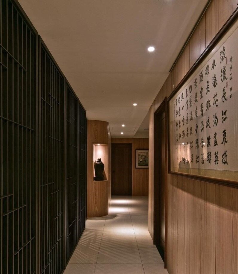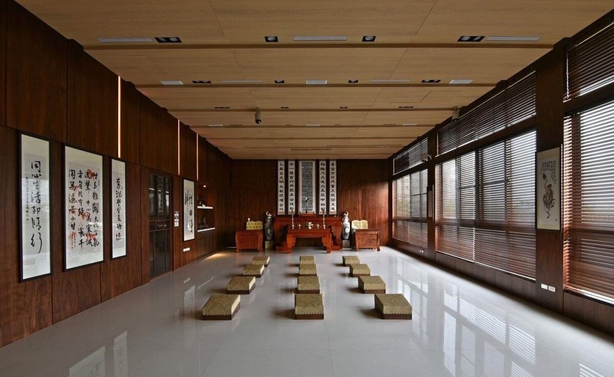 建筑外观,以细腻的线性格栅为主体,在连续不间断的铺陈下,展现律动性与层次感,搭配间接光源,形塑宁静庄严的气场。踏入室内,延续格栅语汇,将其施以木质拉门,让场域间有所连结,维持视线与光线的穿透游走,又能各自独立、确立场域界线。修道区域,透过百叶窗引入和煦日光,在白净地砖、深木色墙面的围绕下,打造平静且沈稳的视觉样貌,使人放下外在喧嚣,潜心投入于佛家学说,借由禅定找寻最纯粹的真我。