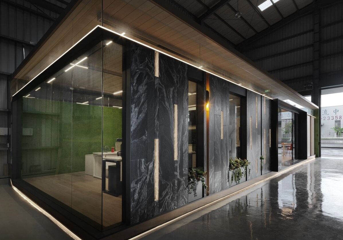 空间外观上,循著细腻的木格栅入内,以深黑大理石揭开主题,透过不规则的几何光影写下一丝轻快的现代感,搭配清玻璃隐隐透出室内绿意,诱人想前往一探究竟。踏入室内,立面铺陈大篇幅的绿植墙,创造会呼吸般的自然气场,而端景墙、柜体与台面,则以浅白大理石细细妆点,彰显奢华却不失质感的特性,照明设计则延续几何线性的铺排,利用不连续的特性一展时尚新潮的氛围,打破一般对石材展示中心的想像。
