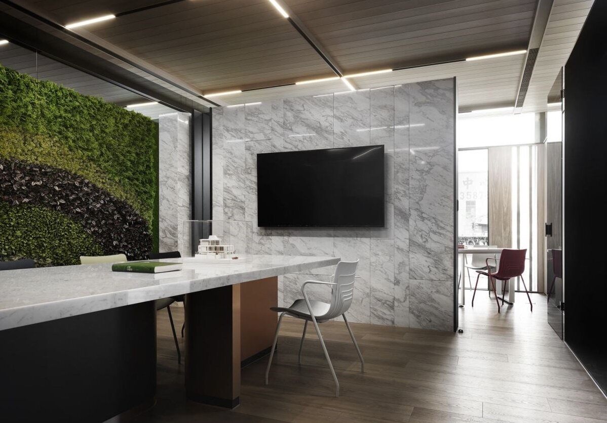 深圳装修设计:走入荒野般的自然魅力!绿意植栽墙X清新木质调 创造最新潮的石材展示中心
