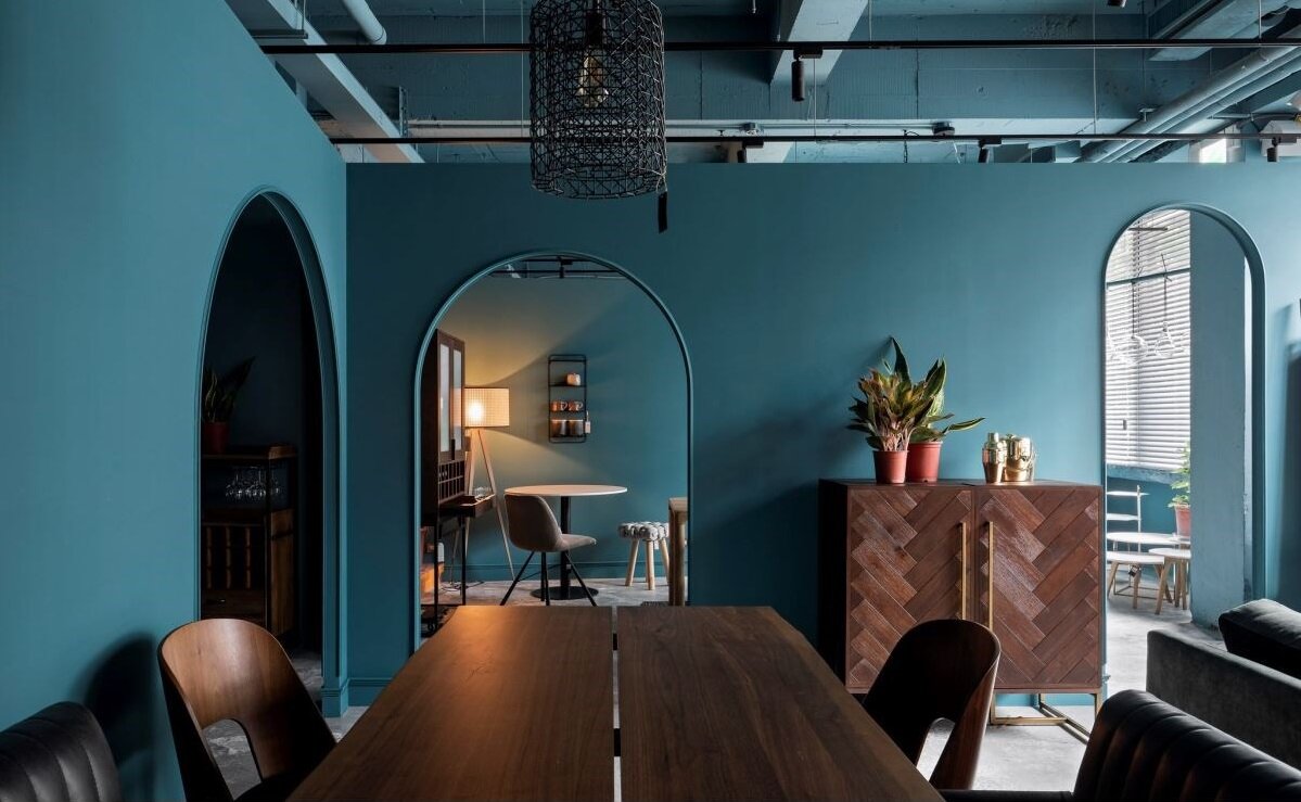 结合选品与家俱的复合式店铺内,以拱门作为开放式场域间划分场域的手法,纯粹的几何立面形塑探索空间的过场,自然质朴的水泥粉光铺陈空间基底,引发来客的好奇心、能自在游走于风格店铺内。设计团队运用大量的异材质带来浓郁的异国情调;土耳其灰蓝为主题并用粉色布幔做搭配,金属材质涵盖了铁网、冲孔板以及铁件,以点线面的方式建构出空间层次。在陈列上除了考虑空间表现外,面对陈列商品的展示架,甘纳空间设计也透过人造石与水皮纸管等特色建材塑造商品主题区,兼顾造型同时也打造稳固坚韧的储藏空间。在刚硬的铁件材质之下混搭粉红色布幔衬底,形塑出各类风格选品的伸展台,也能作为仓库收纳物品、调配空间的弹性,透过空间设计让顾客感受到选品在日常生活的重要性。