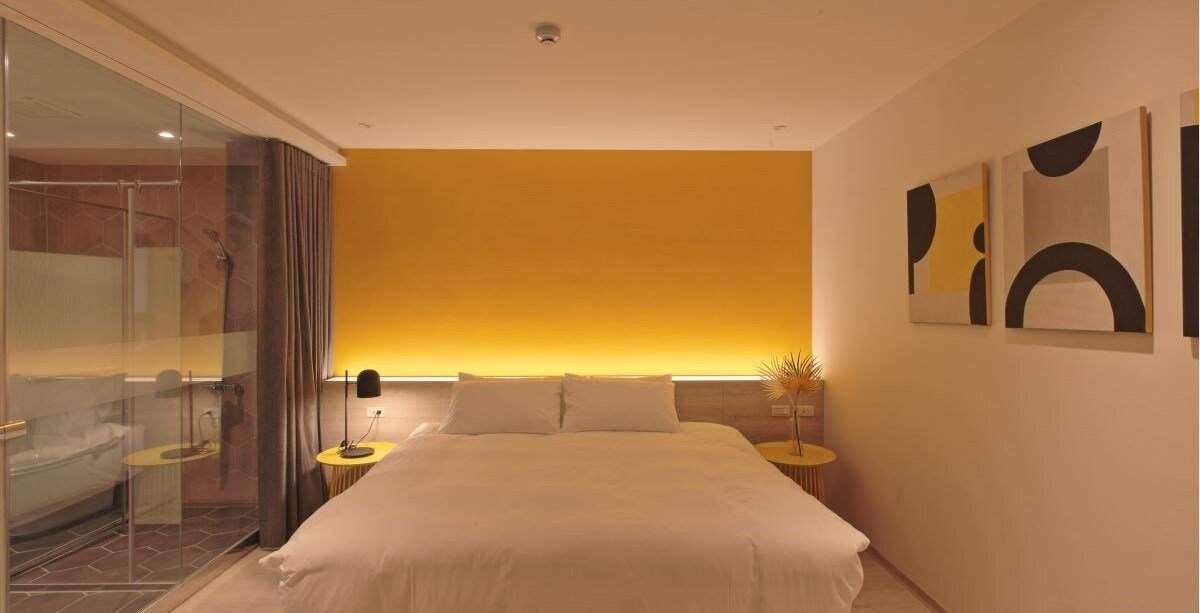 简约风旅店在建材的选择上,使用通过认证的无毒绿建材和防火建材,健康舒适的空间营造,让人可以感受到慢活步调的美好。而在旅店中的各处也能够看到与手绘艺术职人合作的作品,比方接待区的大型挂画、明信片、帆布提袋等,都散发出属于府城的文艺气息。