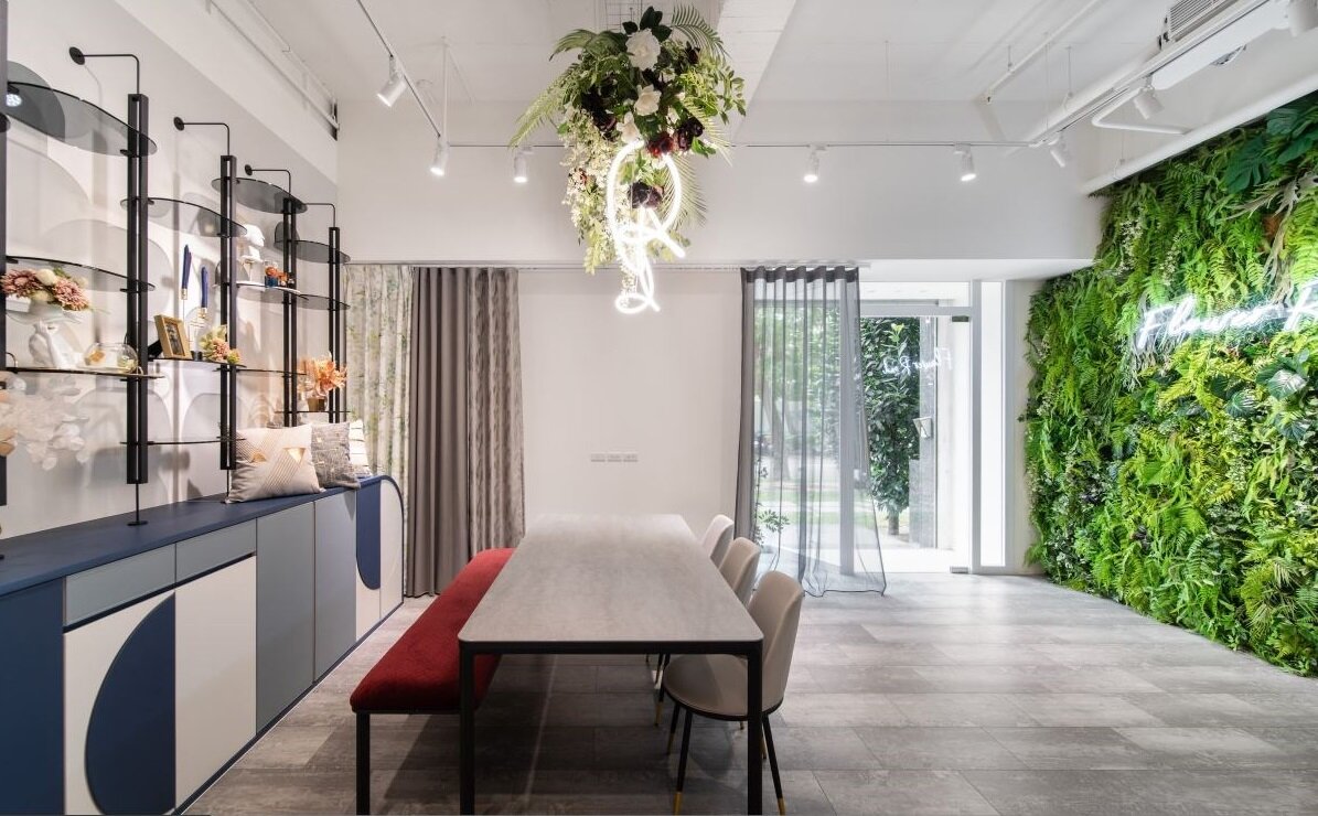 设计师在空间内特别规划一面绿意盎然的植生墙,结合浪漫风情的质感吊椅,塑造令人心生向往的网美打卡墙。会客桌上方的花艺垂坠而下,呼应著植生墙的自然气质,又点出该品牌的核心服务之一,形成优雅的空间景致。一旁展示柜融入 Pantone 经典蓝、椭圆形层板和半圆门片造型等元素,借由细腻的修饰技巧,表现空间的柔和美感。