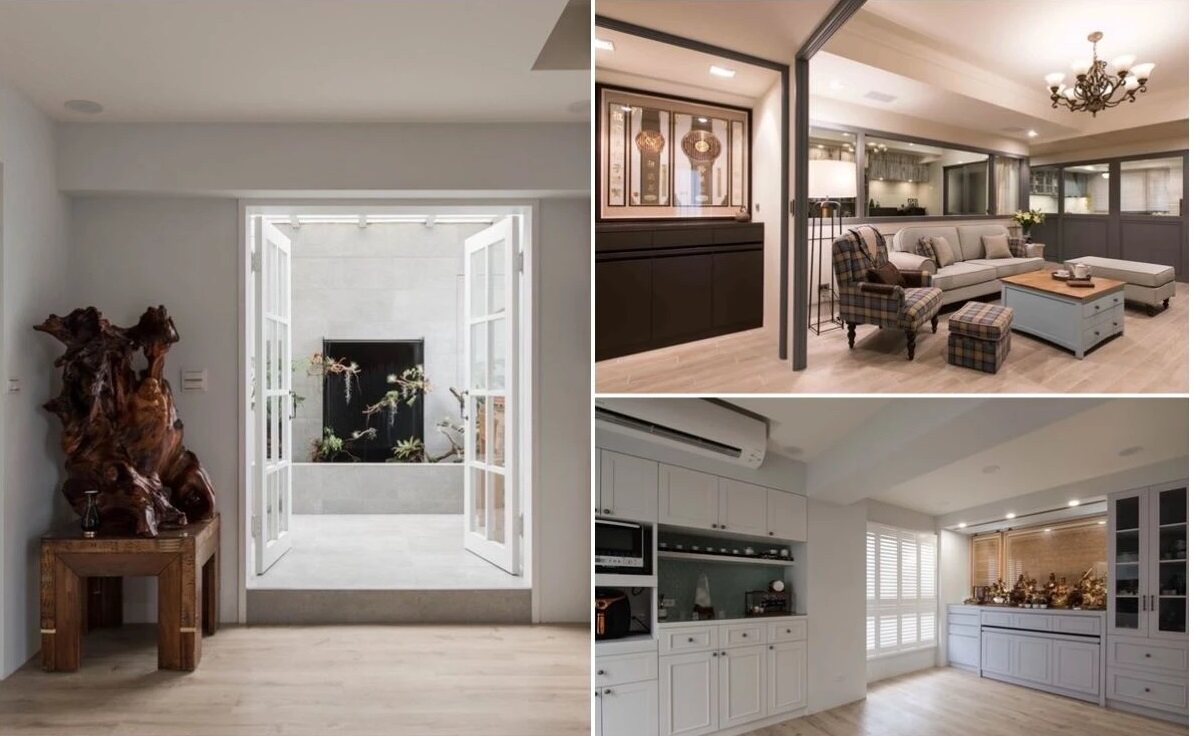 这是一个两户打通共 180平的中古屋,因为屋主需求整体空间设计围绕著风水和神明厅为出发。整体空间以乡村风为主轴,以白色系为主要基调,搭配线板和花砖等材质,将整体空间的异国风情表露无遗。