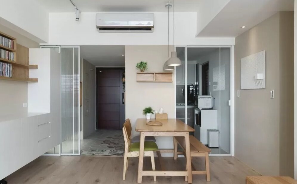 如果开门见全室或是大门直接对落地门窗,中间没有任何屏障阻碍,不但缺乏隐私与安全感,亦是穿堂煞气,除了可以墙壁、柜体化解之外,如果担心家中坪数不大,打造玄关会压缩客厅,让空间窄小压迫的话,不防利用半透明、雾面玻璃隔屏或拉门来阻隔,既解决风水问题也能让采光流通营造穿透感。