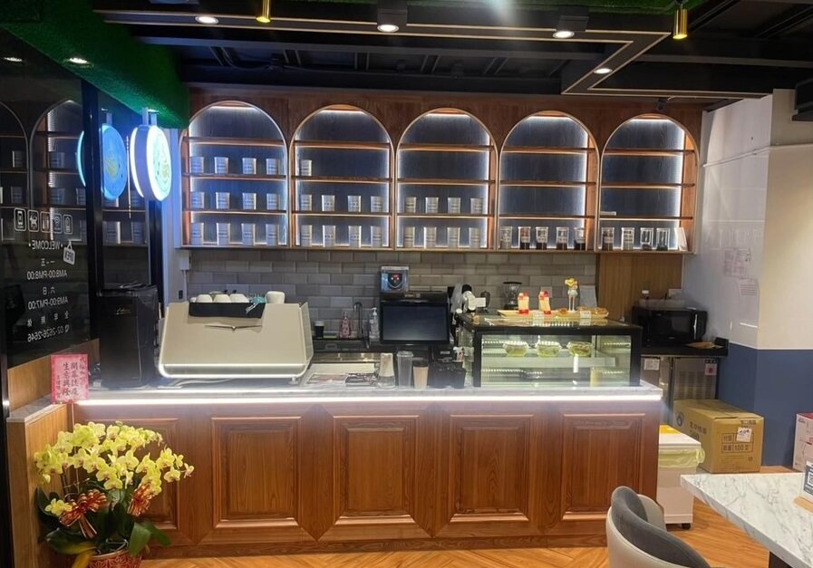 本案位于淡水,风格采用厚重的复古风,很有欧洲或日本老咖啡厅的味道。深邃的木色,以线板、拱型柜呈现,加上颇有律动性的木纹塑胶地板,隐隐呈现流动性,如咖啡般馥郁;而浅色的大理石桌、仿大理石美耐板,不仅点亮空间,更带来Latté的醇厚之感;其中最能加强空间氛围的,是设计师巧妙运用的翠墨绿天花灯轨及海军蓝木纹贴皮,两者相加几乎确立了咖啡厅硬派复古的主调。