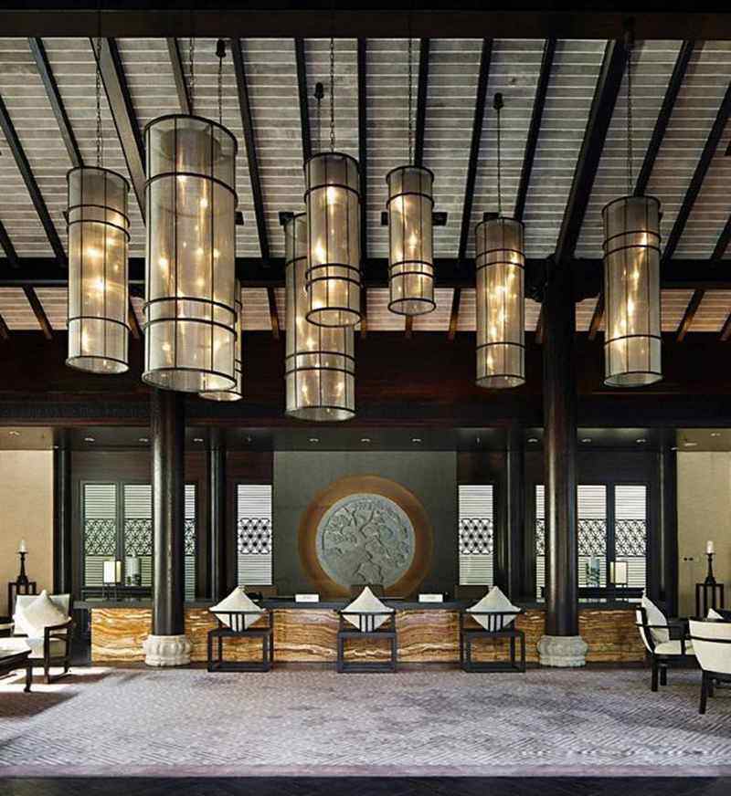 其四:关于中式酒店的灯具选择和灯光设计,跟中式灯具的选择类似,以沉稳为主。颜色和亮度不可太跳,更加偏重于暖光。材质方面,多以亚光黑的铁艺灯和铜材(纯铜或仿铜) 为主,灯罩则为布艺或透光PVC为主,也可以选用玻璃灯罩的中式灯。