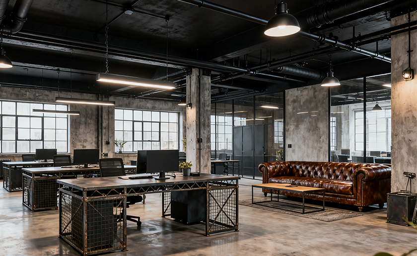 工业风办公室装修的关键是 “裸露元素的秩序化呈现”,尚泰装饰凭借厂房改造经验,形成成熟施工体系。其核心手法为:天花板不做吊顶,裸露管道统一刷黑色哑光漆(提前除锈防锈处理),墙面局部采用水泥漆,其余区域刷深灰色乳胶漆,地面铺设复古水泥砖(供应链直供,性价比高)。